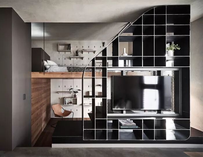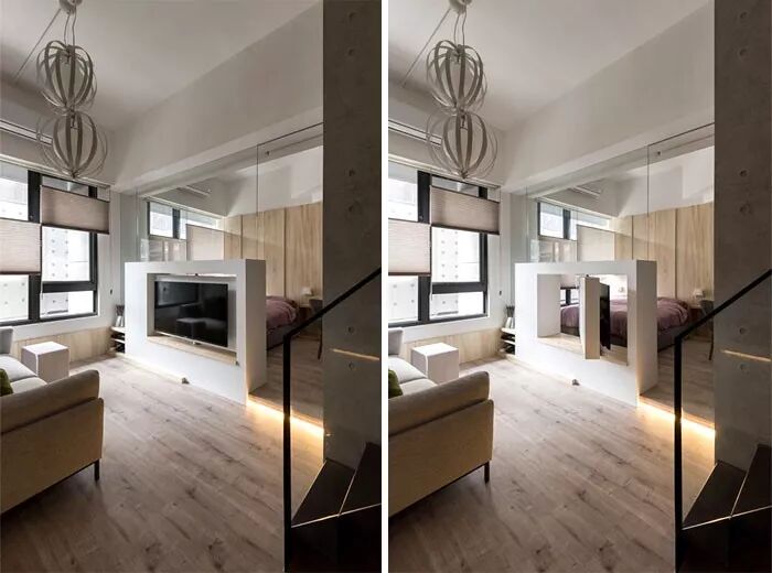依旧是为小户型准备的一种轻隔断设计思路。当然,这样的分隔电视墙,功能也不局限于区分空间,还可以作为收纳柜、照明系统的一部分,甚至作为桌子、橱柜等等。