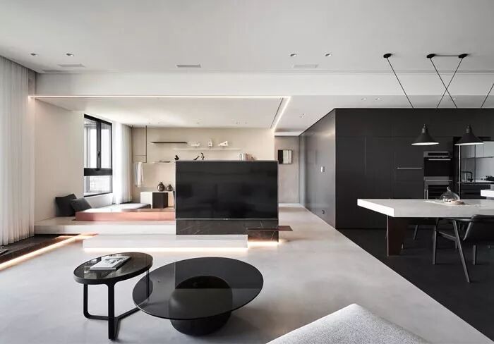 这个案例,区别于上面的白色墙壁,选择了黑色收纳柜+木质电视框,与边上纯白墙壁的餐厅做了明显的空间区分。