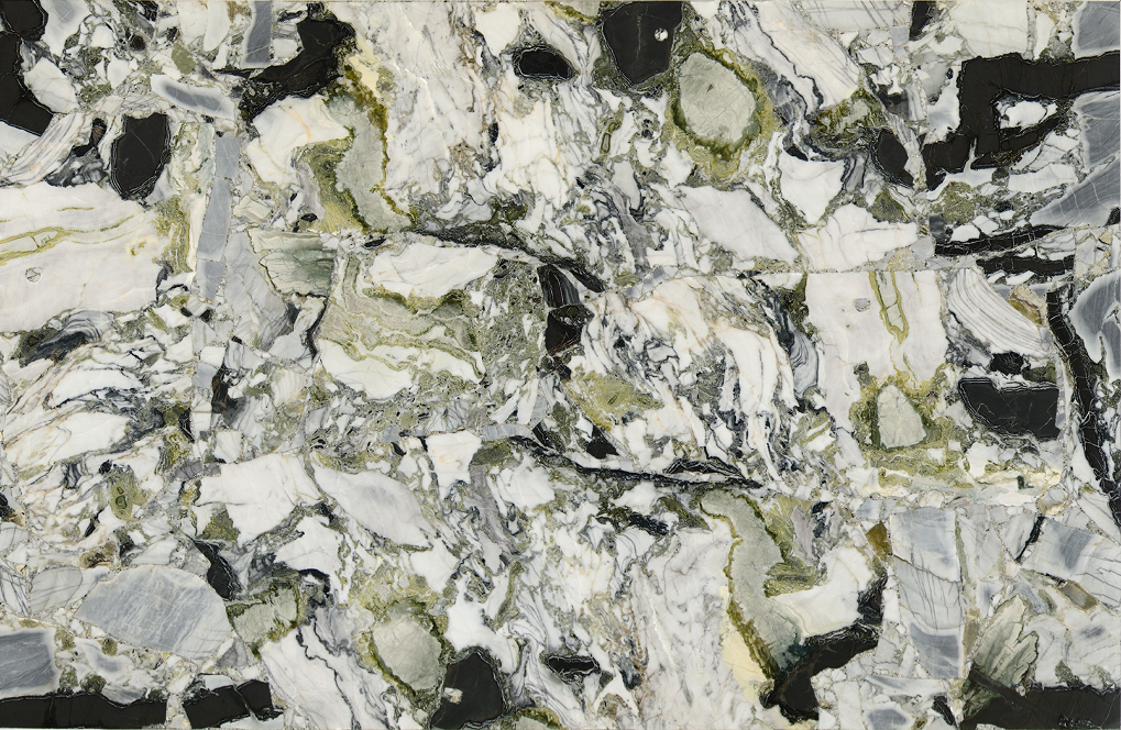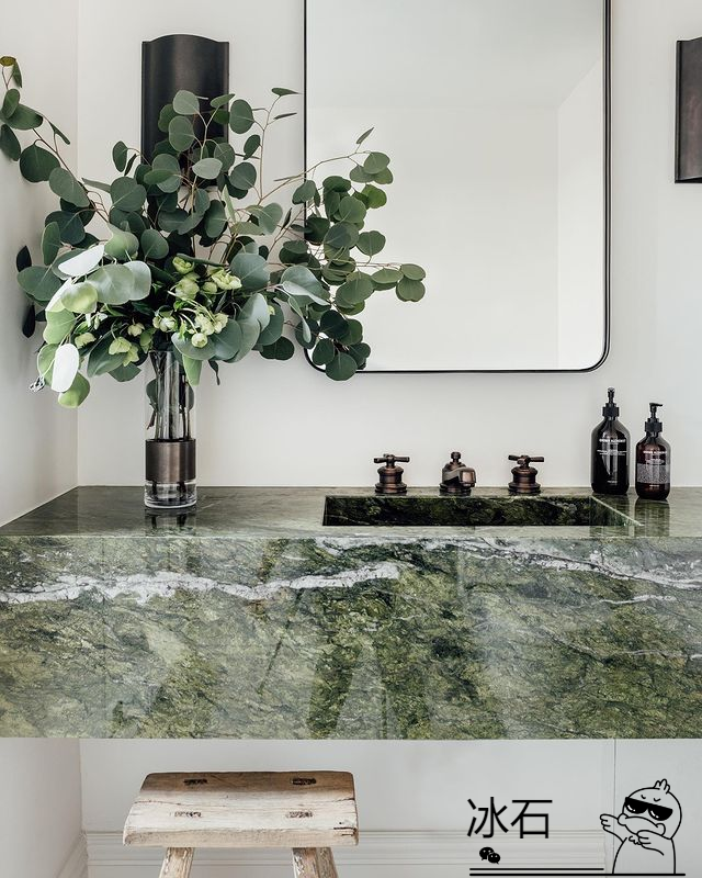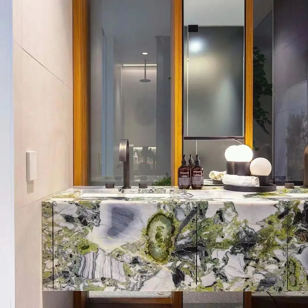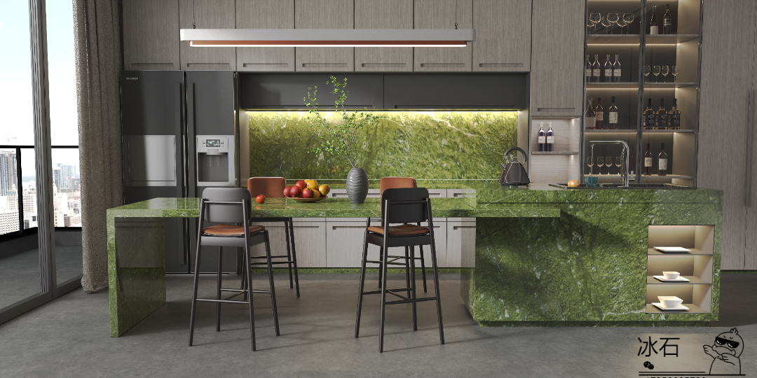 冷翡翠是中国最贵的大理石之一。产自云南,色泽淡绿,石质坚硬,纹理杂而不乱,极其优美,是最受欢迎的绿色大理石之一。因其矿山原因,价格非常昂贵。原板售价最高可达8000一平方,拼接板可达2000一平方。