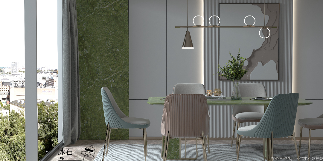丹东绿产自辽宁。其鲜绿色泽和细腻的纹理使其成为近年来大家追捧的绿色品种之一。因它的矿山开采时间有限,所以产量稀少,价格较高,高品质板面售价可达1000一平方。