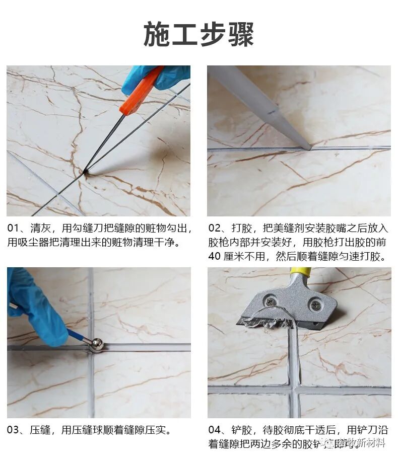 美缝的流程是:清缝、美缝、压缝、铲缝。美缝剂涂抹完成后,需要使用专用压平板进行压实。之后,等待其完全干燥后,再使用铲刀将多余的美缝剂铲除。