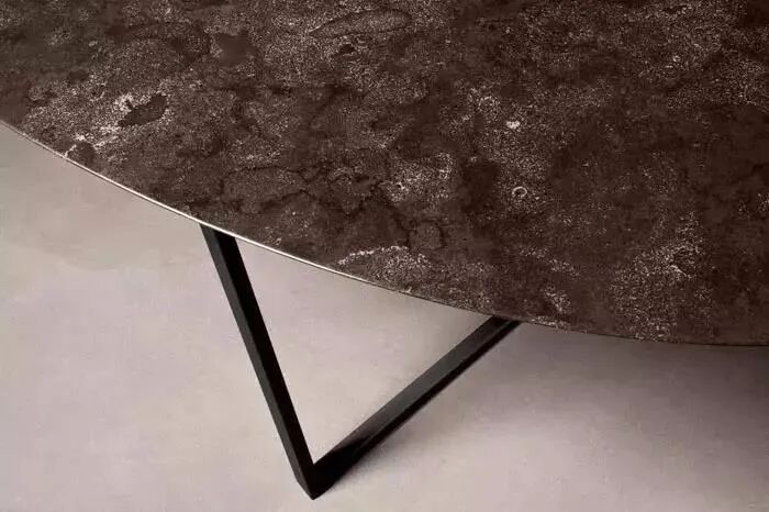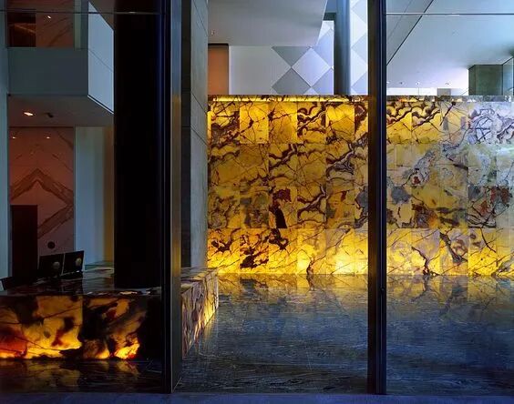 ▲超薄石材桌子的面板04.超薄石材为何可以透光?将玻璃纤维、聚酯材料等粘合固定材料替换成具有透光性能的树脂,然后将超薄石材铺贴在钢化玻璃或有机玻璃之上以增加强度。打光之后超薄石材便具有了透光的特性,光影闪烁之下石材的纹理与色彩的细微变化更加明显,视觉效果极佳。