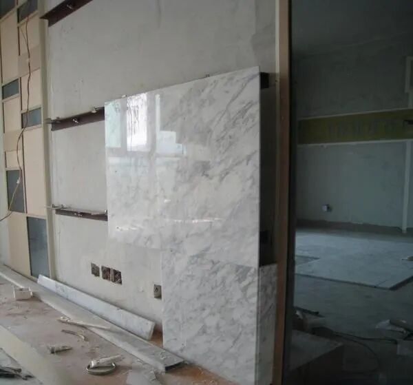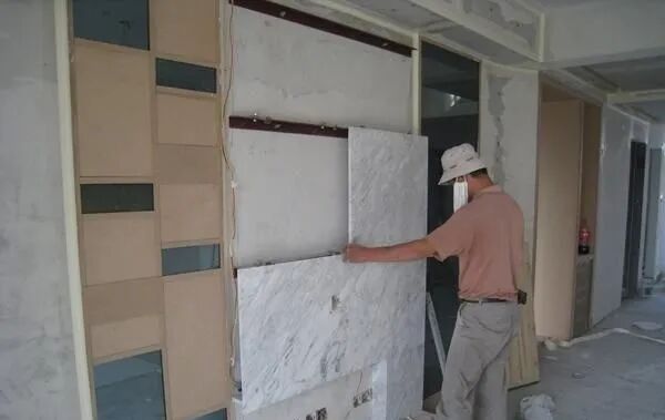 主要程序1.石材采购2.石材铺贴3.石材美容与养护大理石电视幕墙主要有三大类固定方式,固定在水泥、木板或是石材上。这个要注意不同的固定方式钻孔方法也有所不同,同时电线预留的管路和位置要正确,螺丝空洞预留要精确。
