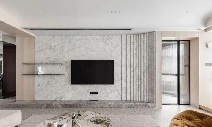 三、镂空安装法设计亮点:保持墙面的整体性和平整性,同时可以将电视保护起来,也有节省空间的效果。适用空间:墙体较厚的任何轻体墙墙面。使用效果:电视放在被玻璃封住的镂空空间里,需要适当对表面的玻璃进行维护,一旦弄脏会影响电视的观赏效果。改造后的电视必须搭配外接音箱才能聆听到更佳的音效,直接使用电视音箱会因空间封闭而受到影响。改造难点:镂空的地方需要进行找平处理。设计缺陷:镂空的电视槽表面如果不覆盖玻璃极易积攒灰尘,如果覆盖玻璃,又需精心打理玻璃,并增加了连接配件时的操作难度。