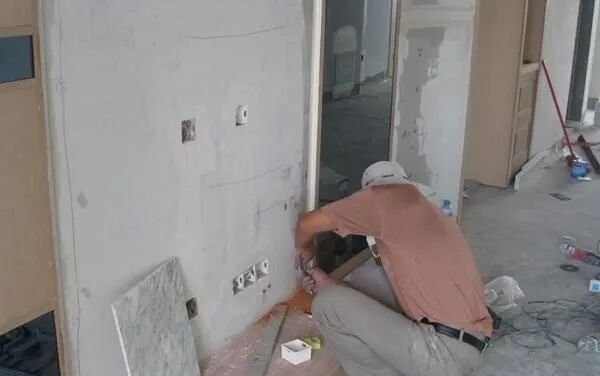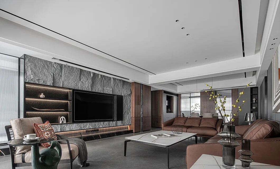 考虑电视机上方的灯光呼应:电视墙一般与顶面的局部吊顶相呼应,吊顶上一般都有灯,所以要考虑墙面造型与灯光相呼应,还要考虑不要强光照射电视机,避免观看节目时眼睛疲劳。木工做电视墙时,看着空调插座,不要把空调插座给封起来了,要封要把插座也挪出来。造型墙面在施工的时候,应该把地砖的厚度、踢脚线的高度考虑进去,使各个造型协调,如果没有设计有踢脚线,面板、石膏板的安装应该在地砖施工后,以防受潮。