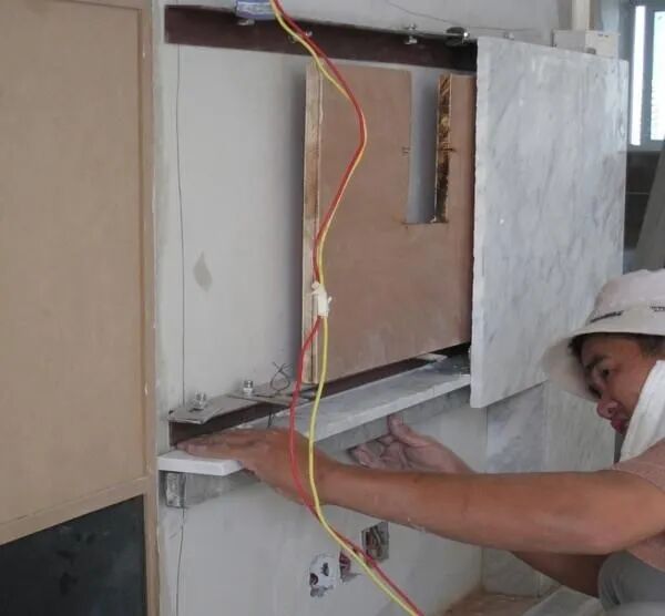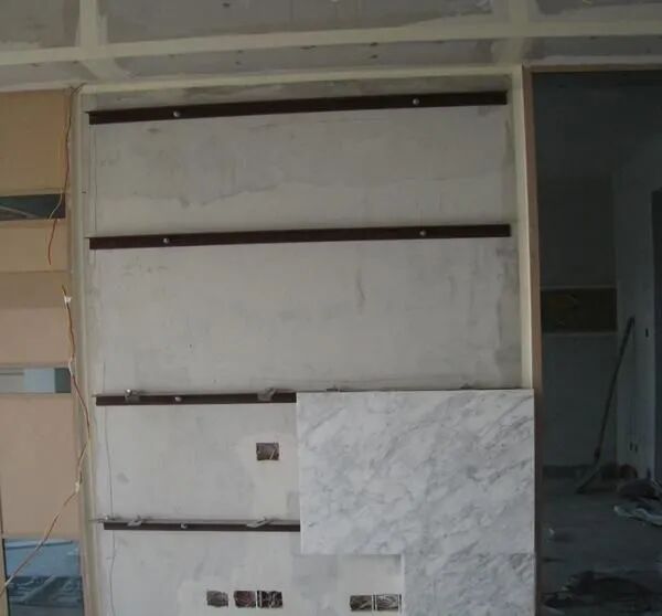 1、由于此案中背景墙面积较大,又凸出墙面10公分,为了安全起见,我们采用干挂形式,也就是在墙面上焊钢架,通过钢架上的固定件和大理石块相连接。这是安装工人在墙面上划线定位,安装固定件。